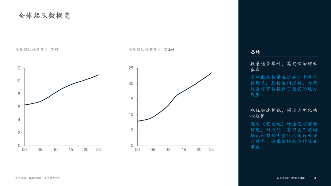 全球船队作为海运贸易的物理载体,其供给呈现两大核心特征,一是船队总规模保持了长达二十余年的稳健增长;二是运力(载重吨)增速与船舶数量增速形成的巨大“剪刀差”,揭示出船舶大型化已成为行业提升效率、追求规模经济的必然选择。